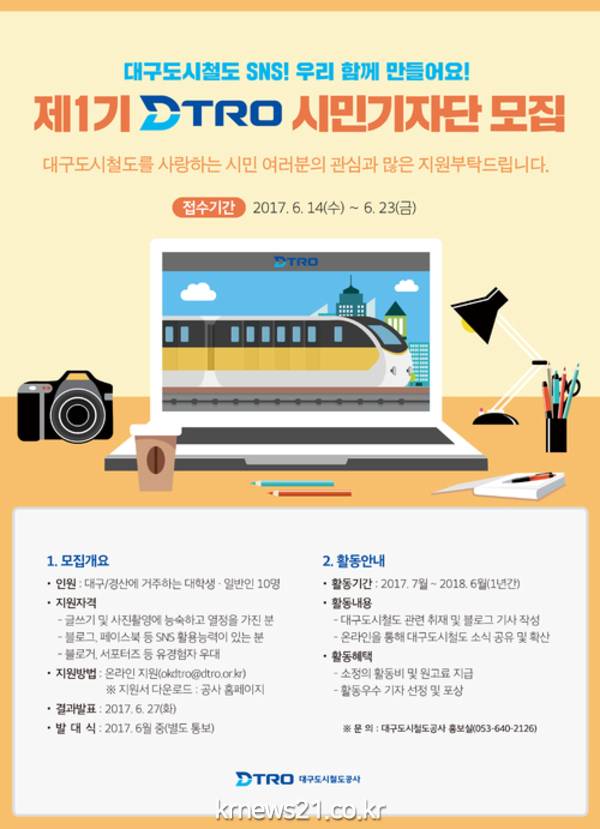 대구도시철도공사는 오는 23일까지 SNS를 통해 도시철도 소식을 전할 '제1기 디트로 시민기자단'을 모집한다.