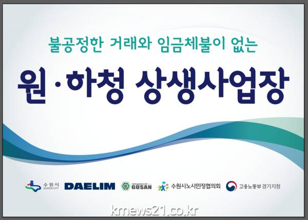 수원시, 수원시 노사민정 협의회, 고용노동부, ㈜대림산업(원청 업체), ㈜구산 토건(하청 업체)은 15일 영통구 이의동 구산 토건 현장사무소에서 ‘불공정 거래와 임금체납이 없는 원·하청 상생협약’을 체결했다.
