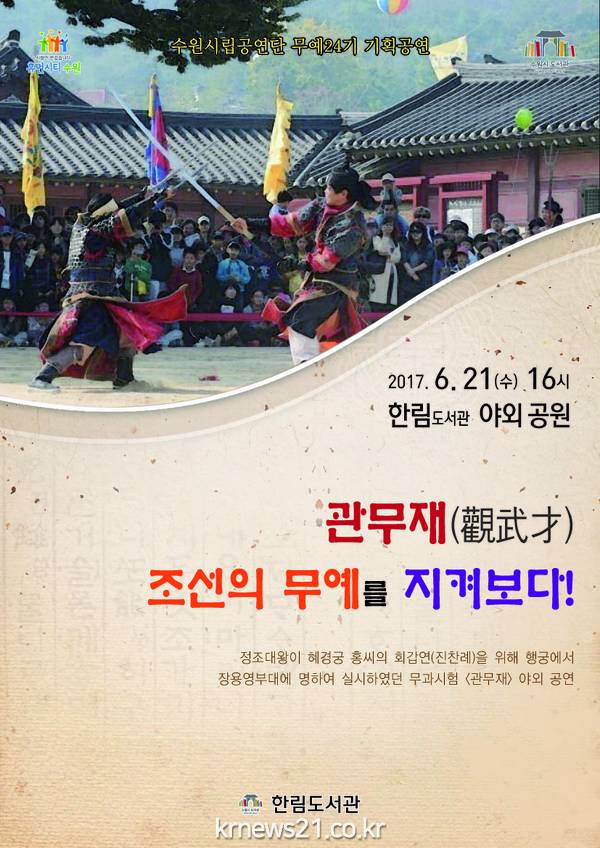 ‘무예24기’ 공연으로 잘 알려진 수원시립공연단의 기획공연 ‘관무재, 조선의 무예를 지켜보다’가 21일 오후 4시 수원시한림도서관 야외공원에서 열린다.