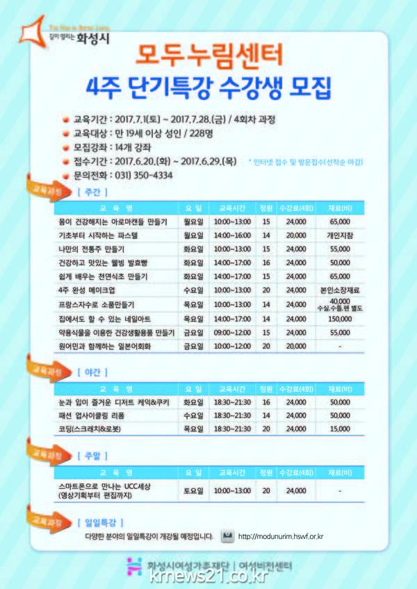 4주 단기특강 수강생 모집과 관련한 자세한 사항은 화성시여성가족재단 여성가족사업 팀(☎031-350-4334)으로 문의 하면 된다.