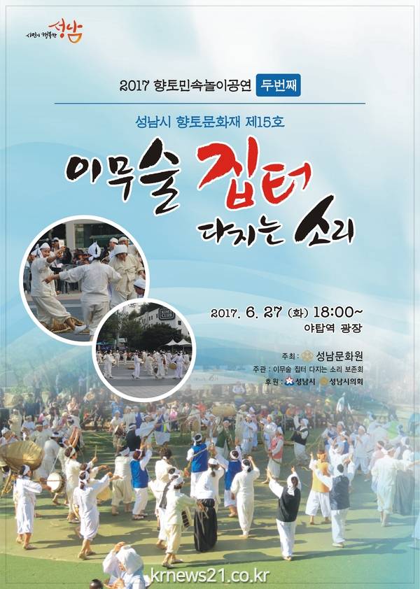 성남문화원(원장/김대진)이 주최하고, 이무술 집 터 다지는 소리 보존회(회장 방영기)주관, 성남시가 후원하는 성남시 향토문화재 제15호 ‘이무술 집 터 다지는 소리’ 공연이 오는 6월 27일 화요일 오후6시 야탑역 광장으로 시민을 찾아가서 개최된다.
