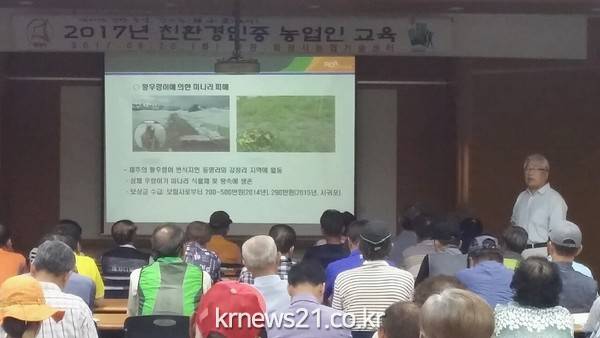 지난 5월 모내기 후 투입된 왕 우렁이가 집단 폐사함에 따라 농업기술센터는 이상범 농촌진흥청 국립농업과학원 유기농업과 박사와 현장을 찾아 원인을 분석하고, 20일 우정읍사무소에서 친환경 벼 재배 농업인 110명을 대상으로 관리요령 교육을 진행했다.