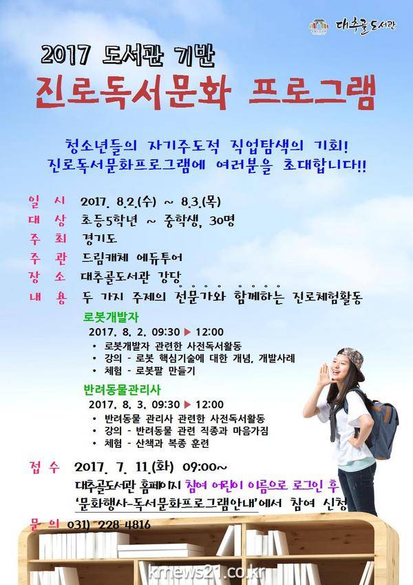 수원시 대추골 도서관은 8월 2~3일 초등학교 고학년(5~6년)과 중학생 등 청소년 30명을 대상으로 진로독서프로그램을 운영한다. 경기도 주최 ‘2017 도서관 기반 진로독서프로그램’ 공모사업에 선정된 프로그램이다.