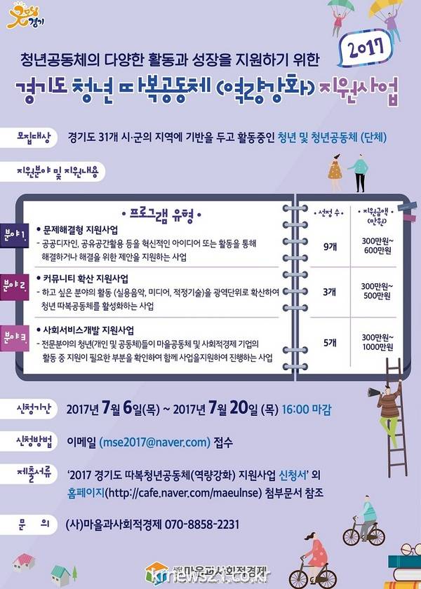 공모 기간은 오는 20일까지이며, 경기도 따복 공동체 지원센터 홈페이지(www.ddabok.or.kr), (사)마을과 사회적 경제 카페(cafe.naver.com/maeulnse), 따복 공동체 카페(cafe.daum.net/ddabok)에서 신청양식을 다운받아 작성 후 이메일(mse2017@naver.com)로 제출하면 된다.