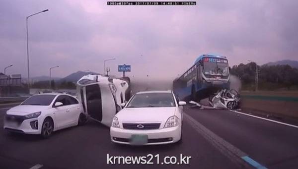 특히 사고 충격으로 멈춰 서있던 차량이 잇달아 크게 파손되는 모습도 확인할 수 있다. 버스 앞유리도 금이 갔고 승객들도 큰 충격을 받았다.