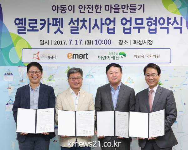 시는 17일 화성시청에서 이원욱 국회의원, ㈜이마트, 초록우산어린이재단과 ‘아동이 안전한 마을 만들기’프로젝트의 일환인 옐로카펫 설치사업 업무협약을 체결했다.