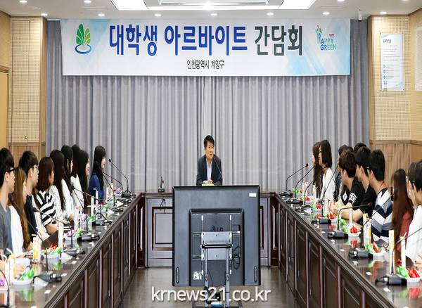 인천 계양구(구청장 박형우)는 지난 17일 여름 방학기간 동안 구청을 비롯해 동 주민센터 및 사회복지시설 등에서 근무하고 있는 아르바이트 1기 참가 대학생 36명과 간담회를 개최했다.