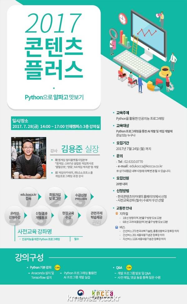 한국콘텐츠진흥원(KOCCA)이 운영하는 한국콘텐츠아카데미가 ‘파이썬(Python)을 활용한 인공지능 프로그래밍’을 주제로 오는 28일 서울 홍릉 콘텐츠인재캠퍼스에서 ‘2017 콘텐츠 플러스(Content PLUS)’ 강연을 개최한다.