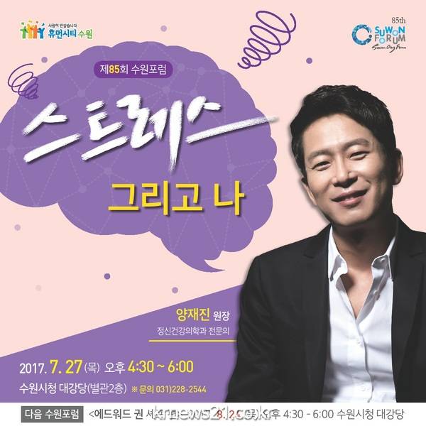 수원시는 27일 오후 4시 30분 수원시청 별관 대강당에서 ‘스트레스 그리고 나’를 주제로 제85회 수원포럼을 연다.