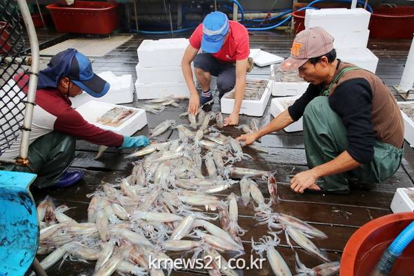 오징어가 본격적으로 수확되고 있어 관심을 모으고 있다.