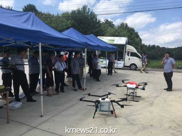 진주시가 지역 농가의 일손을 덜어주는 벼 병해충 항공방제사업에 ‘드론’을 도입했다. 경상남도 정연상 친환경농업과장, 진주시 농업기술센터 박연출 소장이 참석한 가운데 드론 항공방제를 실시했다고 밝혔다.