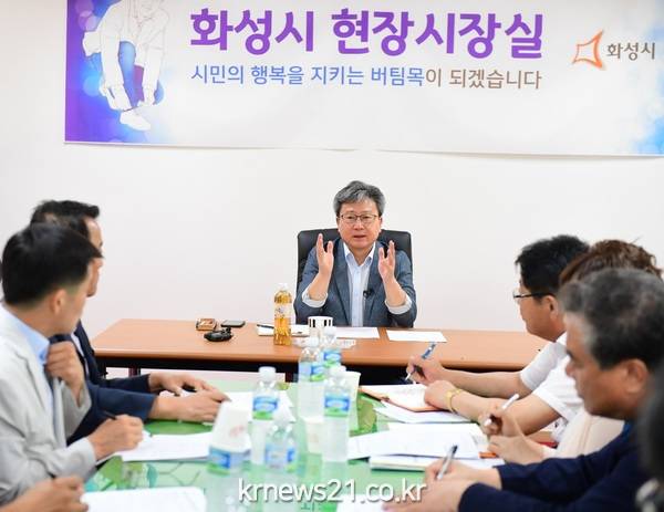 채인석 화성시장이 부영아파트 부실시공 사태를 바로잡고자 7일 동탄 2신도시 부영아파트 내 현장 시장실을 열고 시민들의 고충 덜기에 나섰다.
