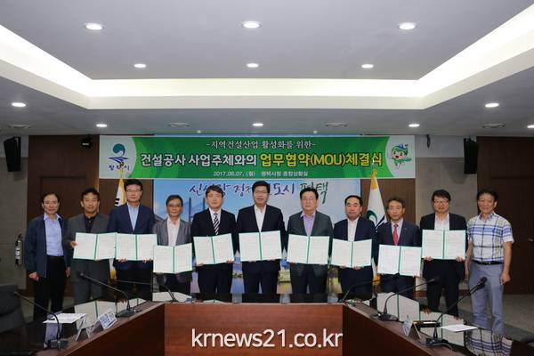 평택시(시장 공재광)는 7일(월) 시청 상황실에서 관내 시행 또는 시행예정인 대형 건설공사 8개 사업주체가 참석한 가운데 “지역건설 산업 활성화를 위한 상생 업무협약(MOU)”을 체결했다.