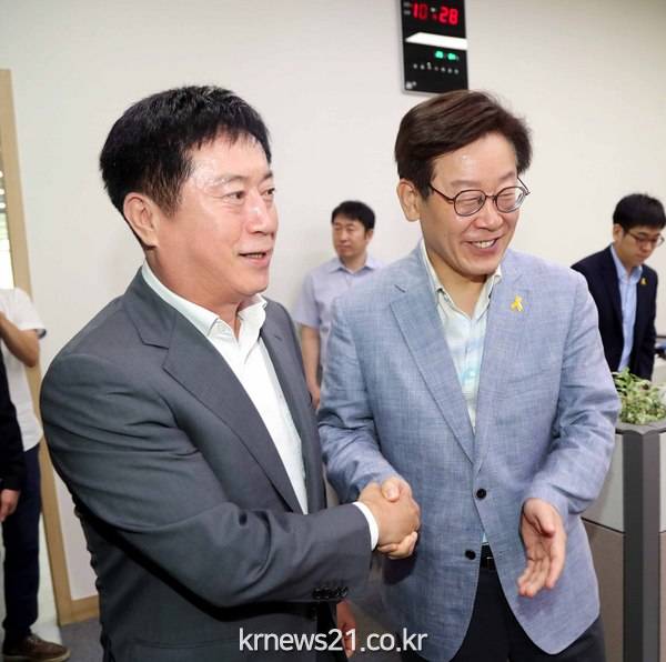 정찬민 용인시장은 이날 오전 성남시청 시장실로 이재명 시장을 방문, 40여분동안 무상 교복 등 문화와 복지정책에 대해 폭넓은 의견을 나눴다.