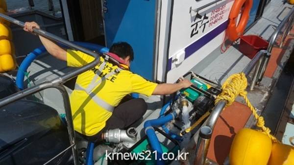침수된 낚시어선 S호는 선부 부분이 침수되어 오른쪽으로 30도가량 기울어져 배수펌프를 이용하여 바닷물을 배출하였다.