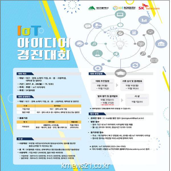 이번 경진대회는 IoT 전문인력을 양성하기 위해 지난 6월 개소한 IoT아카데미가 주관하고 SK텔레콤이 후원하는 행사다. 지역내 기업, 학생, 일반인을 대상으로 IoT 플랫폼과 IoT 디바이스를 활용하여 다양한 분야에 이용할 수 있는 아이디어를 공모한다.