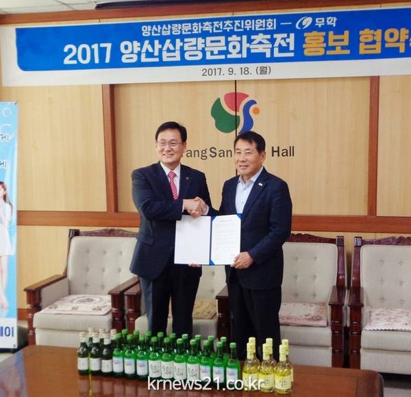 종합주류기업 무학과 양산시가 18일 오전 11시 양산시청 3층 상황실에서 2017 양산삽량문화축전의 성공적인 개최를 위한 홍보지원 업무협약을 체결했다.