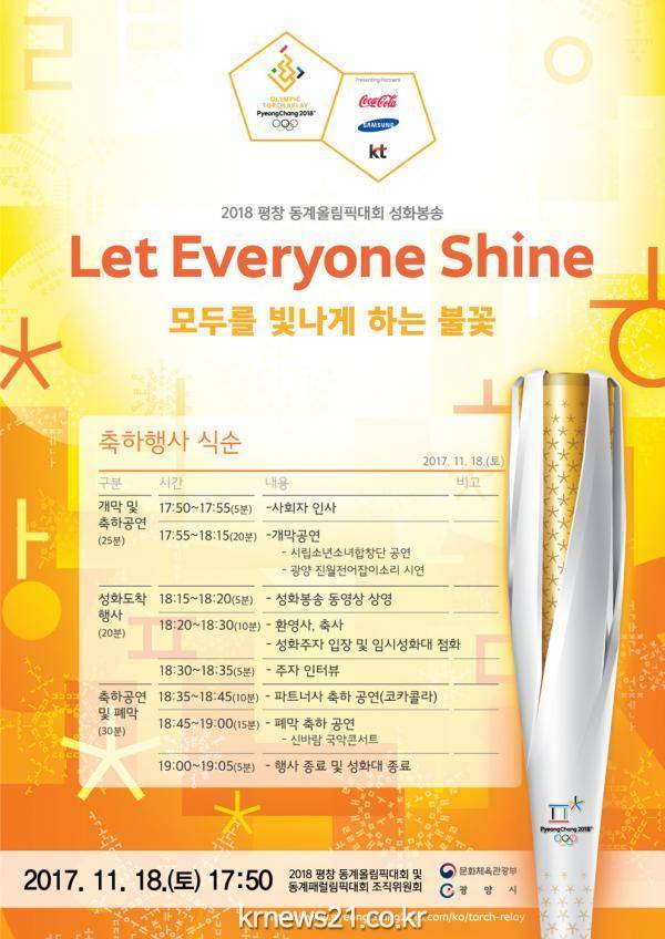 경남도는 ‘2018년 평창동계올림픽’의 성공적인 개최를 위해 11일부터 17일까지 김해를 시작으로 8개 시군을 경유하는 성화봉송을 실시한다고 밝혔다.