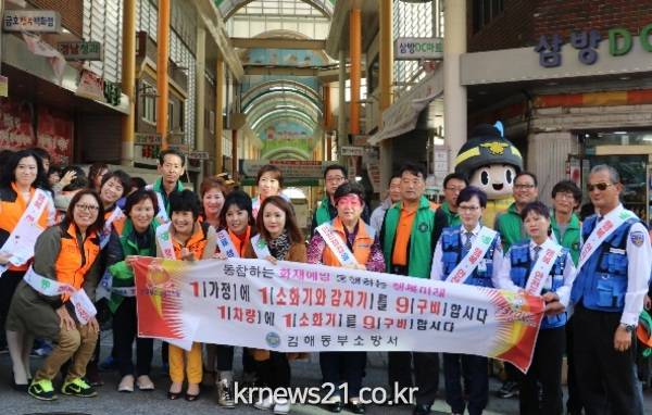 이날 캠페인은 불조심 강조의 달을 맞아 유동인구가 밀집돼 있는 전통시장에서 주택용 소방시설 보급 확산을 통한 안전문화 정착을 위해 소방공무원과 의용소방대원, 김해시청 등 유관기관이 참여해 주택용 소방시설(소화기, 단독경보형감지기)의 중요성을 안내하며 홍보 캠페인을 진행했다.