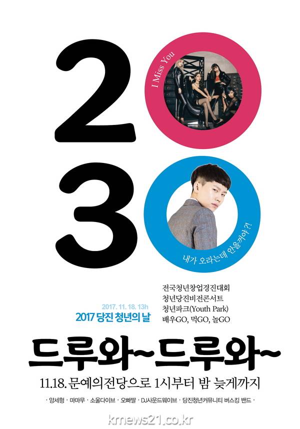 같은 시간 당진문예의전당 야외공연장에서는 ‘청년파크’가 마련돼 청년창업가가 참여하는 청년창업박람회와 함께 각종 체험부스와 지역청년커뮤니티 부스가 운영된다.