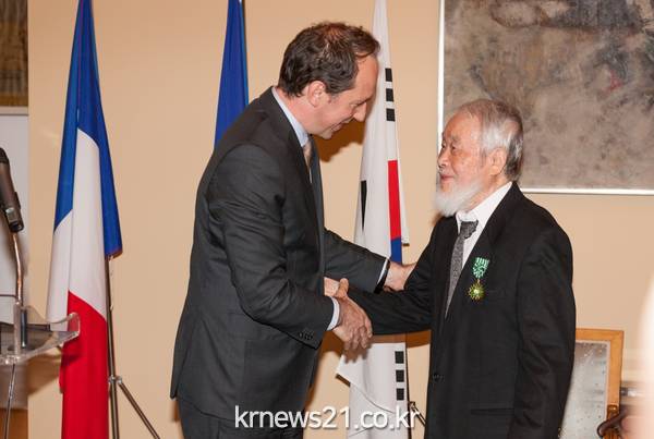 24일 제주도에 따르면 김 화백은 지난 23일 오후 주한프랑스대사관에서 파비앙 페논 주한프랑스대사로부터 프랑스 문화예술공로훈장 '오피시에'를 받았다.