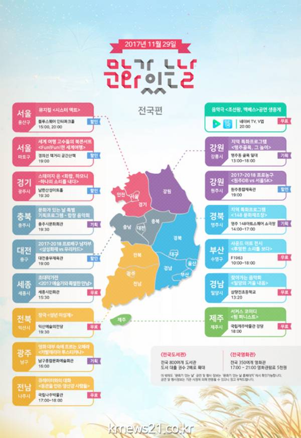 매달 마지막 수요일은 일상에서 문화를 더욱 쉽게 접할 수 있도록 문화체육관광부(장관 도종환, 이하 문체부)가 지정한 ‘문화가 있는 날’이다. 2017년 11월 ‘문화가 있는 날’(11. 29.)과 해당 주간에는 총 2,650개(11. 27. 기준)의 문화행사가 전국에서 펼쳐진다.