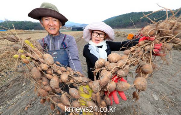 경남 산청군 신등면 가술리 거동마을 양재혁(62)씨 부부가 병충해가 없고 크기가 커 슈퍼 아피오스로도 불리는 봉란(鳳鸞) 아피오스를 수확하고 있다.