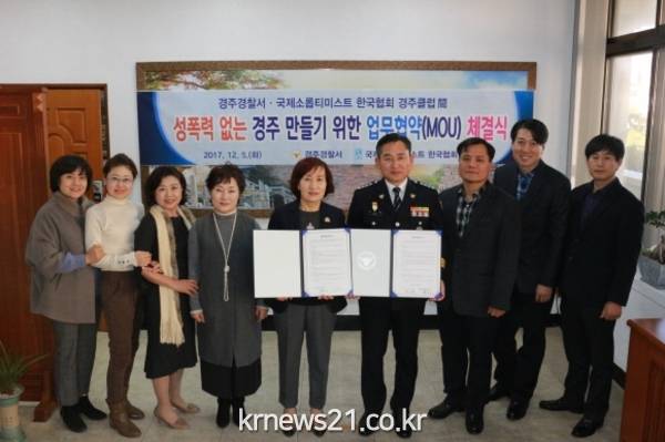 경주경찰서(서장 양우철)는 지난 5일(화) UN 소속 국제여성봉사단체인 국제 소롭티미스트 한국협회 경주클럽과 사회적약자인 소녀와 여성의 권익과 성폭력 예방 및 피해 여성을 경제적 지원하기 위한 업무협약(MOU)를 체결했다.