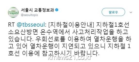 이 사고로 뒤따르던 1호선 상행선 전동차 운행이 각각 약 10분여씩 지연됐다.