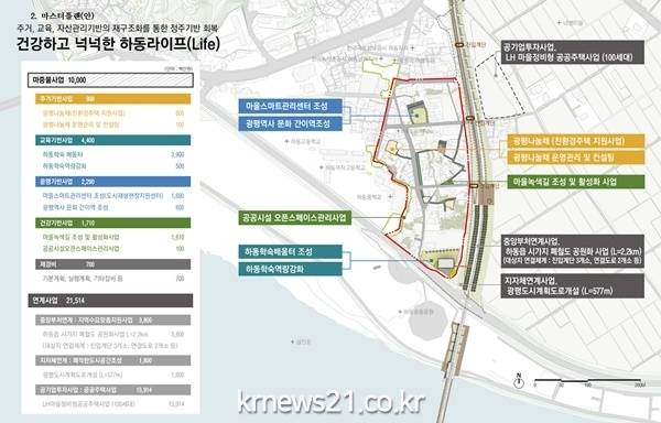 그리고 도시재생 현장지원센터 역할을 할 마을관리스마트센터와 광평역사 문화 간이역을 조성해 자산관리운영 기반을 구축하고 마을녹색길 조성 및 활성화, 공공시설 오픈스페이스 관리사업 등 건강기반사업도 추진된다.