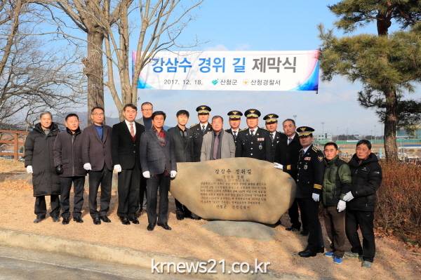 산청군과 산청경찰서는 18일 산청 출신 호국영웅 강삼수 경위를 기리기 위한 '강삼수경위길'명예도로명 표지석 제막식을 가졌다.