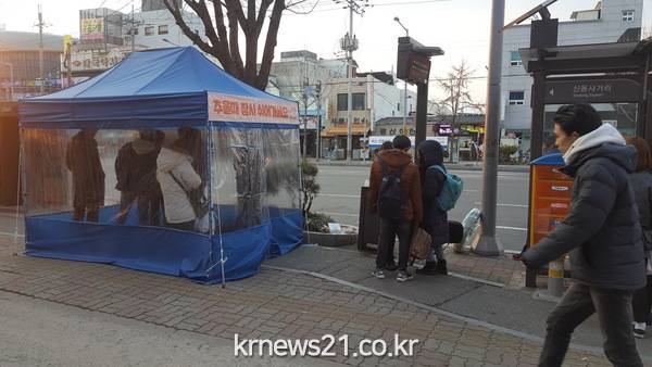 온기텐트는 송정역 맞은 버스정류장과 송정공원역 버스정류장에 각 1개씩 세웠다. 바람을 막기 위해 네 면에 차단막을 둘렀다. 차단막은 기다리는 시내버스 도착 여부를 안에서 파악하도록 투명비닐로 만들었다. 또 누구라도 부담 없이 이용하도록 ‘추울 때 잠시 쉬어가세요’라는 문구를 온기텐트 밖에 걸었다.