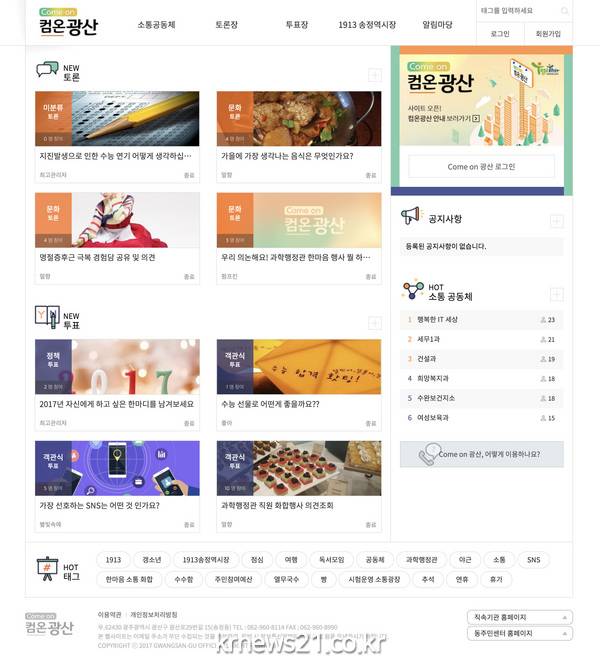 광산구 관계자는 “시민의 공감이 더 좋은 자치공동체를 만든다. 지역 소셜네트워크의 역할을 하고 있는 온라인소통플랫폼 ‘광산365’와 커뮤니티간 소통을 지원하는 ‘컴온광산’이 시민들의 참여 기반을 넓히는 데 일조할 것”이라며 “참여가 삶의 질 개선으로 이어지는 구정 운영을 위해 많은 이용 바란다”고 당부했다.