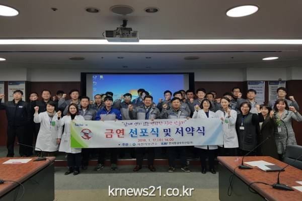사천시보건소(소장 강덕규)는 17일 금연 실천율 향상 및 건강한 직장환경 조성을 위해 사남면 소재 한국항공우주산업(주)외 2개 사업장 금연펀드 희망자 35명과 함께 금연선포식을 개최했다.