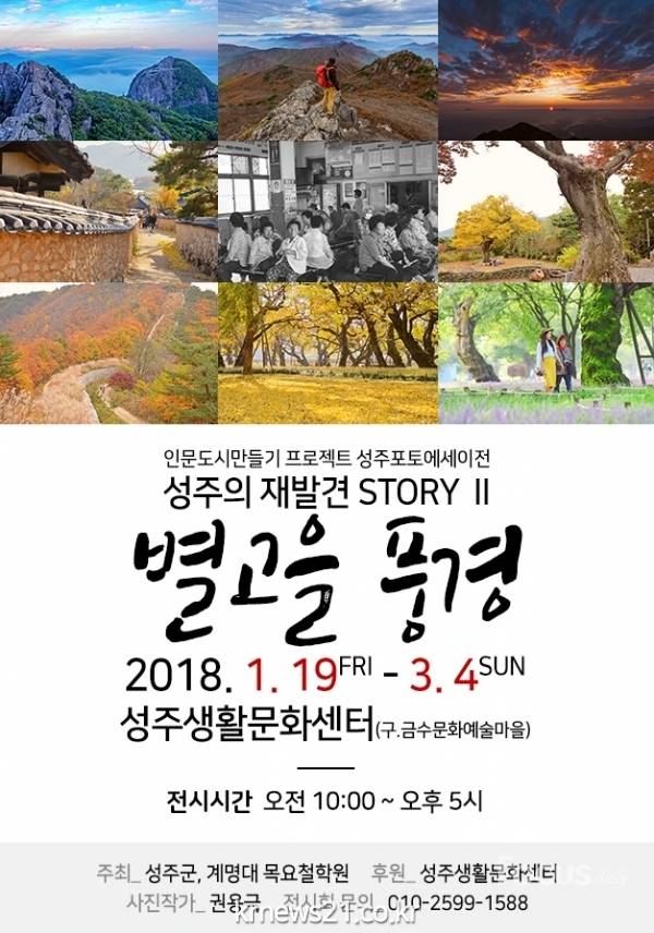 이번 사진전은 작년에 열렸던 <성주의 재발견 STORY Ⅰ – 삶이 축제다>에 이어 <성주의 재발견 STORY Ⅱ – 별고을 풍경> 이라는 주제로 권용극 전문사진작가가 성주 곳곳을 직접 돌아다니며 찍은 15점의 사진을 전시한다.
