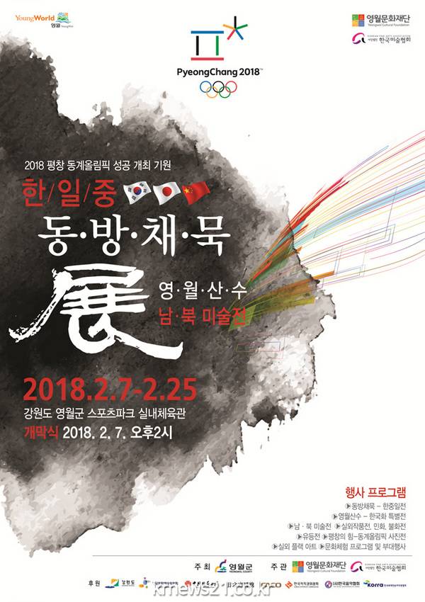 한국 미술계를 대표하는 사단법인 한국미술협회(이사장 이범헌)는 2018 평창 동계올림픽 성공을 기원하는 "한일중 동방채묵전(東方彩墨展)"을 강원도 영월군 스포츠파크 특별전시장에서 2018년 2월6일(화)~2월25일(일)까지 진행한다. 개막식은 2월7일(수) 14:00 열리며 축하공연, 작가소개, 작품공개 등 다양한 프로그램이 진행될 예정이다.