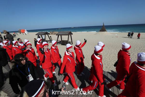 13일(화) 북한 응원단은 빡빡한 일정 속에서 첫 나들이 장소로 문화올림픽 파이어 아트페스타 2018 헌화가‘獻火歌’가 전시된 경포해변을 찾아 작품을 둘러보는 시간을 가졌다.