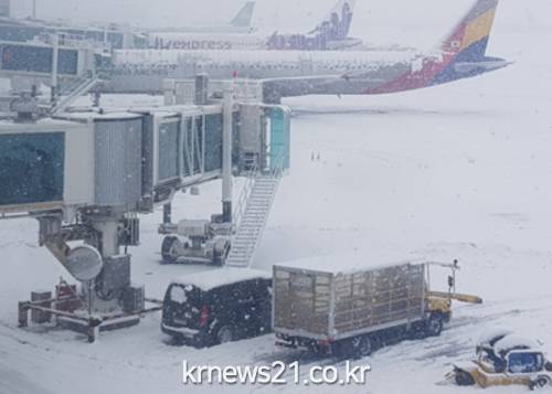 밤사이 내린 눈으로 대구공항을 드나드는 항공기 결항·지연이 속출했다.