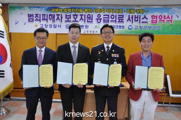 (전북/뉴스21)김문기기자=고창경찰서( 서장 김성재 ) 청문감사실에서는 지난 5. 24 중요 범죄피해자 보호와 사회적 약자 지원을 위해 고창병원, 석정웰파크병원, 고창군보건소와 무상 의료서비스 등을 주요 골자로하는 기관간 협약식을 체결했다.