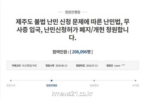 지난 13일 '제주도 불법 난민 신청 문제에 따른 난민법·무사증 입국·난민신청허가 폐지 및 개헌을 청원합니다'라는 제목으로 올라온 청원글은 18일 오전 9시30분 현재 20만8천96명의 참여자를 확보, 한 달 내 20만 명 이상 참여했다.