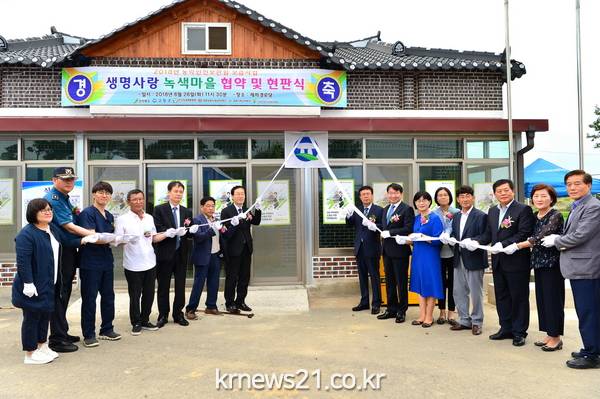(전북/뉴스21)김문기기자=고창군정신건강복지센터(임소연 센터장)가 26일 흥덕면 제하마을회관에서 농약안전보관함 생명사랑 녹색마을 현판식을 개최했다.
