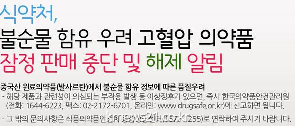 ▲ (캡쳐=식약처)발암 유발 물질이 포함된 것으로 의심되는 중국산 발사르탄 원료의약품 중 104개 품목에 대해 판매 중지와 제조 중지 조치가 해제됐다.