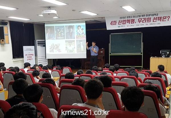 ▲ (사진=창원시청)창원시는 13일 마산합포중학교에 이어 마산합포구 해운중학교에서 2학년 학생 136명이 참석한 가운데 ‘4차산업혁명, 우리의 선택은?’이라는 주제로 특강을 개최했다.