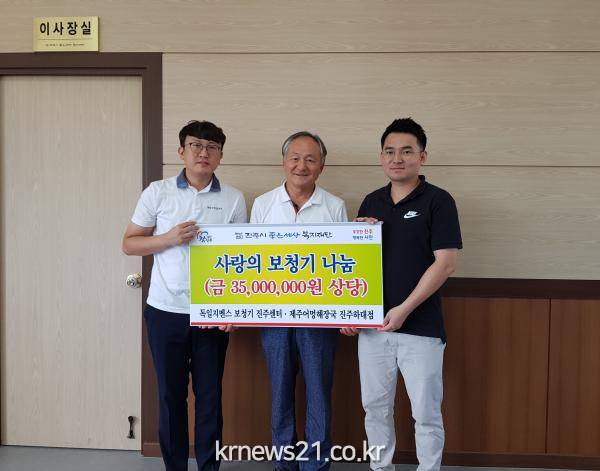 ▲ (사진=진주시청)지난 14일 독일지멘스 보청기 진주센터(대표 권현우)와 제주어멍해장국 진주하대점(대표 홍창열)은 진주시 좋은세상 복지재단(이사장 이상호)을 방문하여 사랑의 보청기 16대(환가액 3천500만원 상당)를 기부했다.