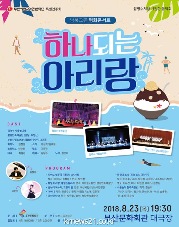 매년 8월 열리는 부산시립국악관현악단의 ‘팥빙수처럼 시원한 음악회’, 올해는 더욱 의미가 있는 무대로 우리가 하나가 되어 부르는 아리랑이 조그마한 평화의 씨앗이 되어 남북의 평화, 한반도의 평화를 불러오는 아리랑이 되었으면 하는 마음으로 꾸미는 무대이다.