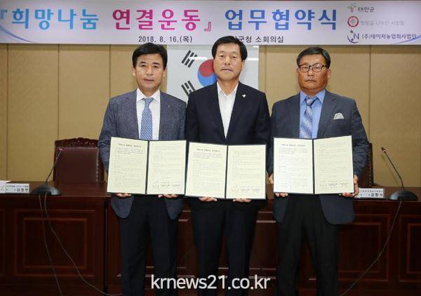 군은 지난 16일 군청 소회의실에서 (사)희망을 나누는 사람들(회장 김정안), ㈜네이처영농조합법인(대표 강항식)과 업무협약을 체결하고 ‘희망나눔 연결운동’의 힘찬 시작을 알렸다.