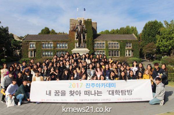▲ (사진=진주시청)진주시(진주아카데미)는 고등학생을 대상으로 8월 27일부터 9월 7일까지 대학탐방 수강생을 진주아카데미 홈페이지를 통해 온라인으로 모집한다. 수강료는 5만원이며, 컴퓨터 추첨을 통해 80명을 선정하여 오는 10월 27일(토) ~ 28일(일) 양일간 서울대, 연세대 등 서울 일원을 탐방할 예정이다.