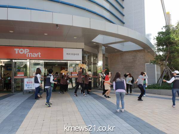 ▲ (사진=진주시청)진주시가 경주지진 발생 2년째를 맞아 진주시청 네거리 등 시내 일원에서 지진대비 국민행동요령 홍보 캠페인을 전개하고 12일에는 공공청사와 민간시설을 대상으로 지진대피훈련을 실시했다.