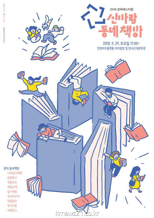 ▲ (사진=인천문화재단)2018년 책의 해를 기념해 인천문화재단이 인천의 동네책방들과 손잡고 즐거운 문학 난장을 준비했다. 9월 29일(토)에 인천아트플랫폼 야외광장 등에서 열리는 2018 문학페스티벌 <신바람, 동네책방>이 그것이다. <신바람, 동네책방> 축제에는 총 9개의 인천 동네책방(국자와주걱, 딸기책방, 나비날다, 책방산책, 책방모도, 연꽃빌라, 세종문고, 말앤북스, 북극서점)과 출판사(글누림, 다인아트, 소와다리)가 참가한다. 강화에서 부평까지 인천 곳곳에 자리 잡은 동네책방들이 각자의 주제(자연, 그림이 있는 책, 페미니즘, 청소년, 시대정신, 동물복지, 실용도서, 글쓰기, 독립출판)로 북큐레이션 부스를 꾸민다. 또한 책방 주인과의 특별 상담코너도 마련되어 있어 독립출판이나 동네책방 운영에서부터 취미와 연애까지 재미있는 주제로 1:1 상담을 할 수 있다.