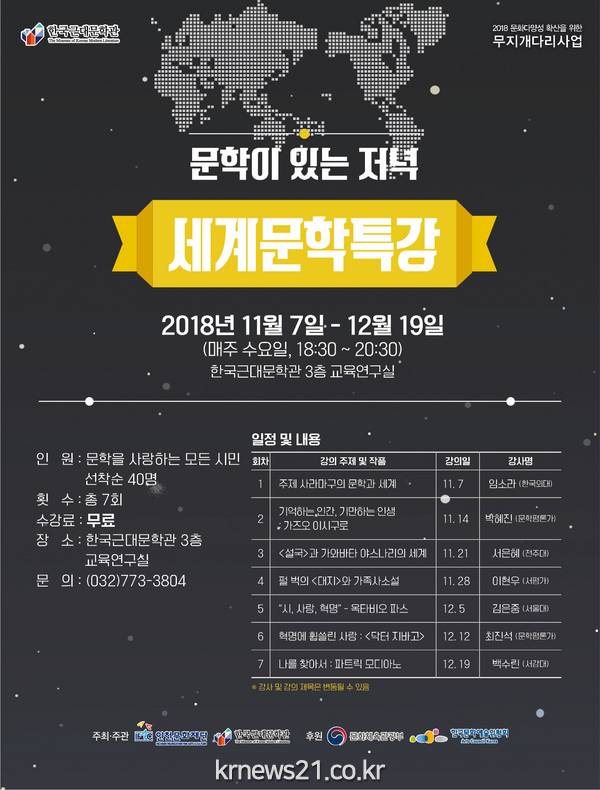 ▲ (사진=인천문화재단)인천문화재단 한국근대문학관(대표이사 최진용) 2018년 <문학이 있는 저녁-세계문학특강>이 11월 7일 시작된다. 매주 수요일 저녁 6시 30분부터 2시간 동안 총 7회에 걸쳐 진행된다.